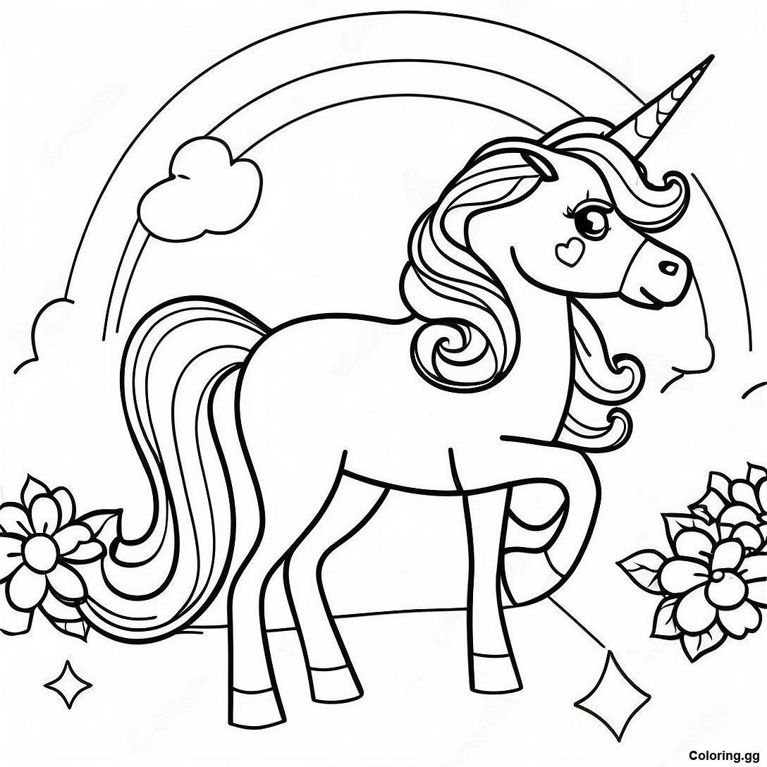 Завантажити версію Чарівний Єдиноріг На Розмальовці З Веселкою для друку в PDF