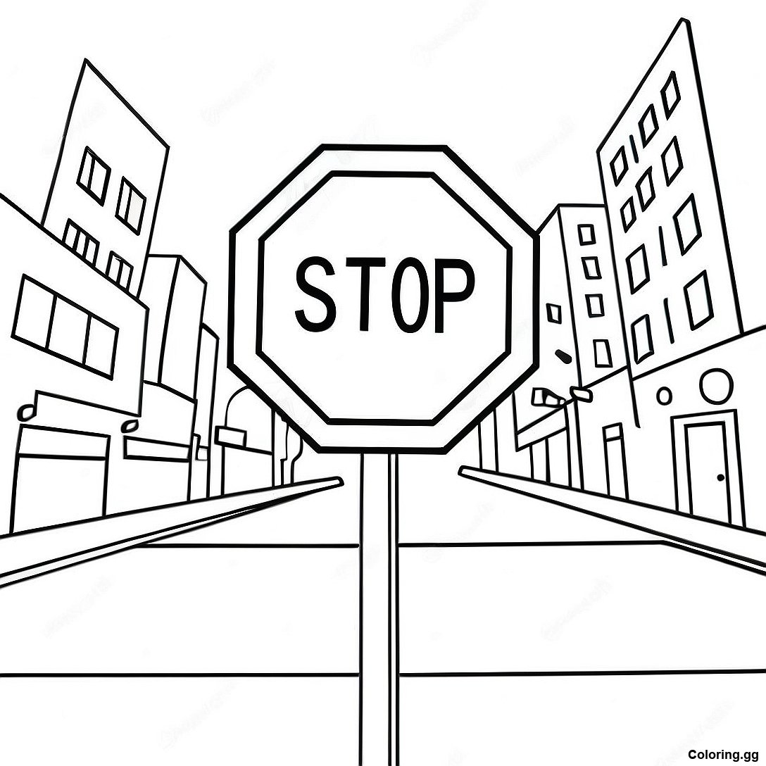 Завантажити версію Мультяшний Знак Стоп У Місті - Розмальовка для друку в PDF
