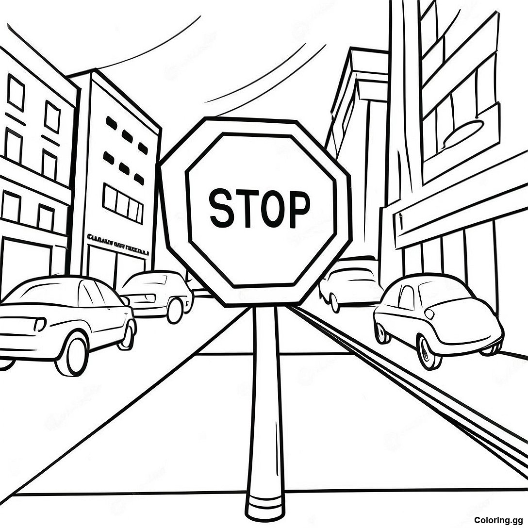 Завантажити версію Мультяшний Знак Стоп У Місті - Розмальовка для друку в PDF